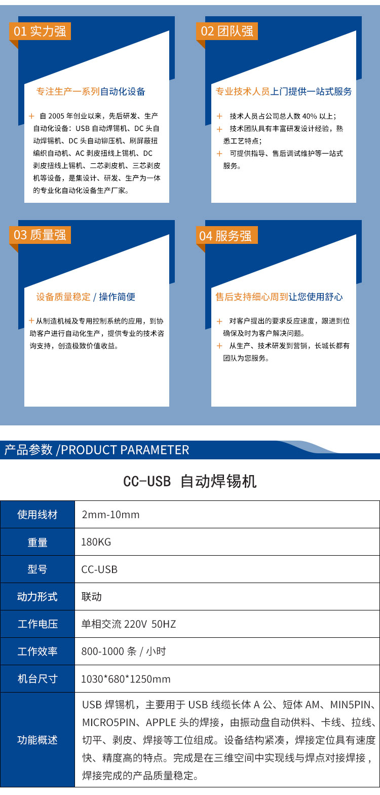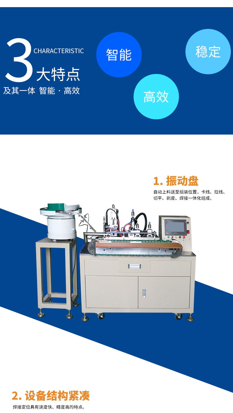 USB自動焊錫機,主要用于USB線纜長體A公、短體AM、MINI5PIN、MICRO5PIN的焊接,由振動盤自動供料、再分線、拉線、切平、剝皮、
