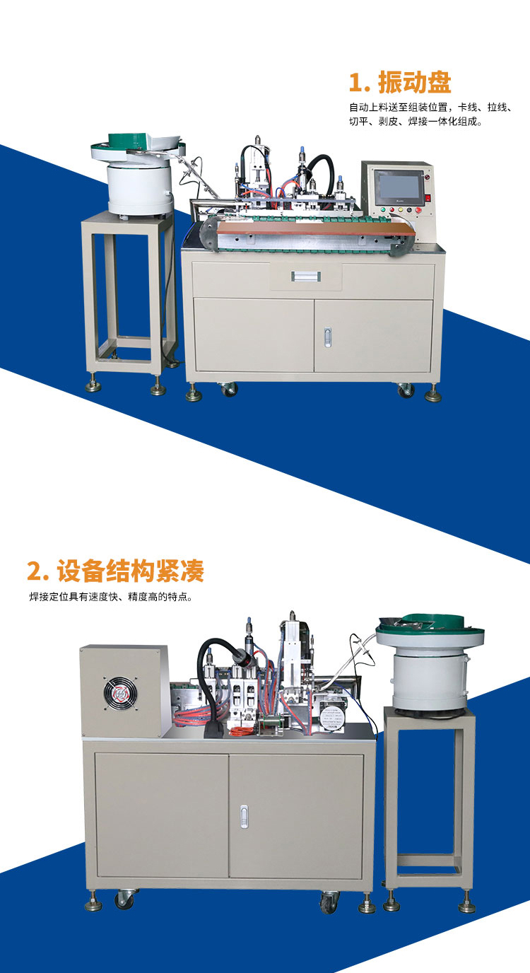 USB自動焊錫機,主要用于USB線纜長體A公、短體AM、MINI5PIN、MICRO5PIN的焊接,由振動盤自動供料、再分線、拉線、切平、剝皮、