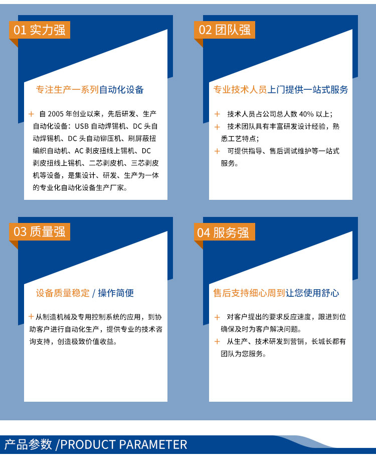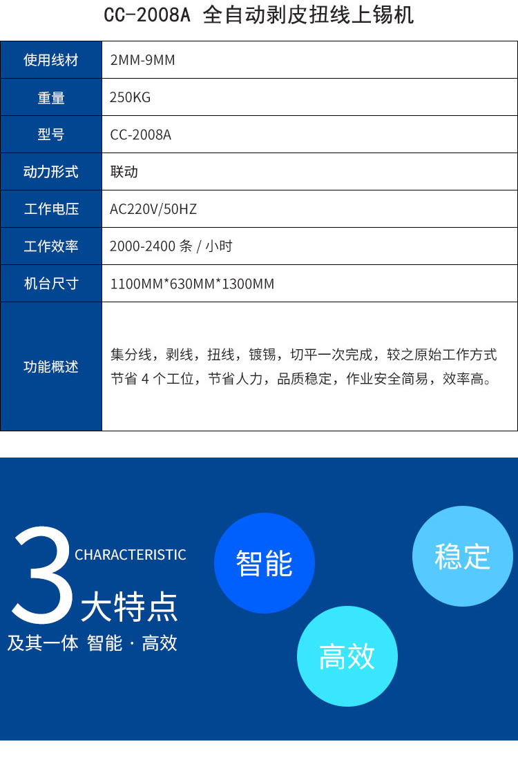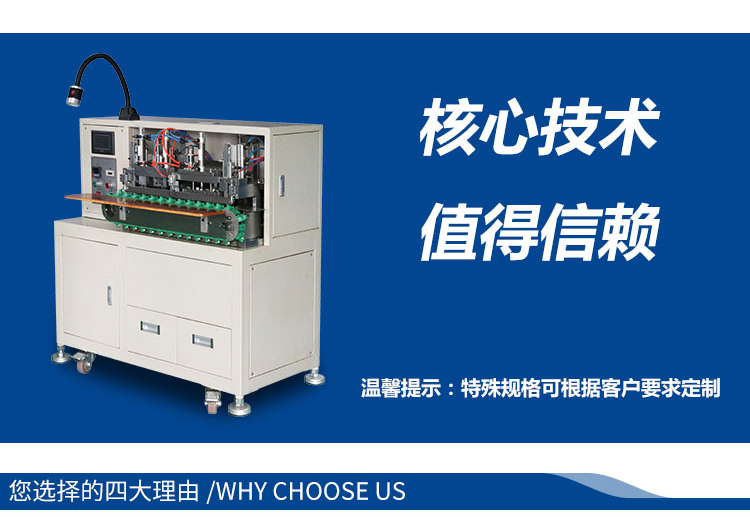產品介紹:集分線、剝線、扭線、鍍錫、切平、一次完成,品質穩定,操作簡單,效率高,較之原始工作方式節省4個工位,提高效率。