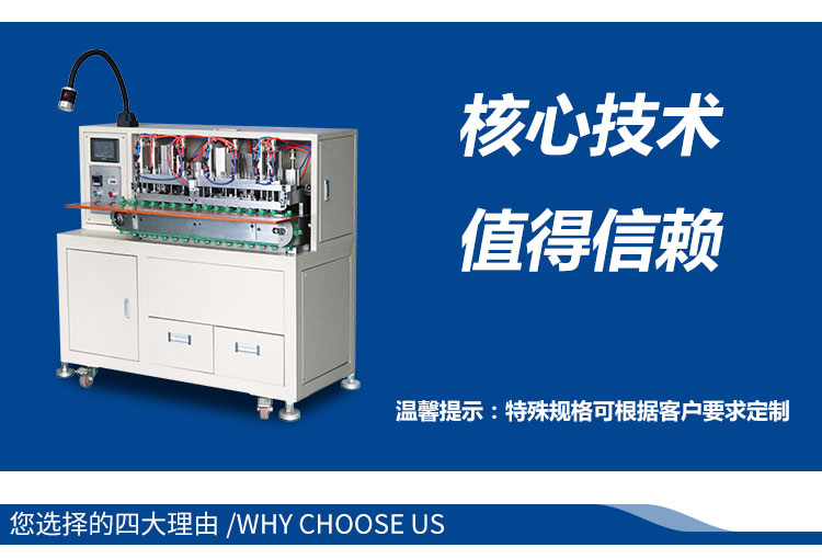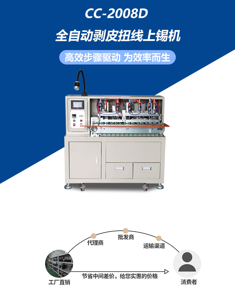 產品介紹:集分線、剝線、扭線、鍍錫、切平、一次完成,品質穩定,操作簡單,效率高,較之原始工作方式節省4個工位,提高效率。